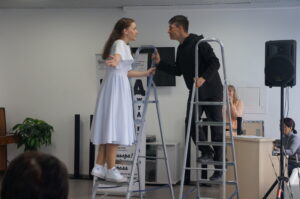 Галина много рассказала о новом подходе к классике, о современных режиссерских решениях, о замыслах, которые были вложены в спектакль: монохромная одежда артистов, стремянки вместо балконов и т.д.