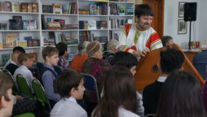 На встрече Владимир познакомил зрителей со славянской музыкой, рассказал о себе, своем творчестве и, конечно, исполнил песни под звуки гуслей.