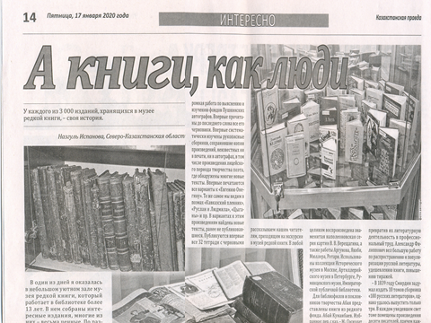 «… Практически у каждого издания, оказавшегося в почетных рядах музея редкой книги областной библиотеки, есть своя удивительная история. Выкройте немного времени, загляните в библиотеку, вспомните (если забыли), как это увлекательно – выбирать книгу, переворачивать шелестящие страницы, разглядывать иллюстрации, обложку…» О богатом фонде нашего музея и судьбе наиболее ценных его экземпляров в статье Назгуль ИСПАНОВОЙ «А книги, как люди» в «Казахстанской правде» (17 января 2020 г.)