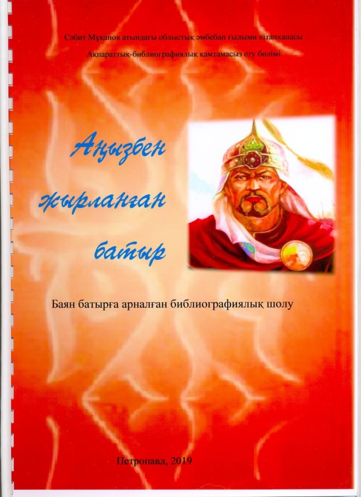 Аңыздарда жырланған батыр (Батыр Баян жайында) [Мәтін]: библиографиялық шолу /құраст. К. Әбілкәрімова; С. Мұқанов атындағы ОӘҒК, ақпараттық-библиографиялық қамтамасыз ету бөлімі.- Петропавл, 2019. - 27 б.