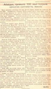 Абайдың туғанына 100 жыл толуына арналған салтанатты мәжіліс // Ленин туы. – 1945 – 19 август (№163)
