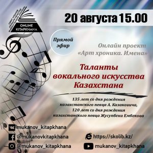 Онлайн-проект «Арт хроника. Имена». Прямой эфир «Таланты вокального искусства Казахстана». 135 лет со дня рождения казахстанского певца А.Казакевича, 120 лет со дня рождения казахстанского певцы Жусупбека Ембекова.