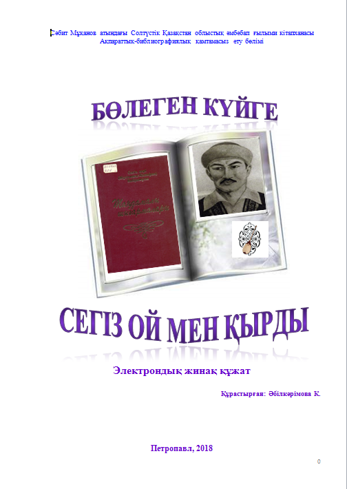 Бөлеген күйге Сегіз ой мен қырды [Мәтін]: электрондық жинақ құжат /құраст. К. Әбілкәрімова; С. Мұқанов атындағы ОӘҒК, ақпараттық-библиографиялық қамтамасыз ету бөлімі. - Петропавл, 2018. - 86 б.