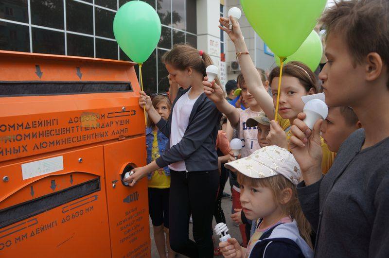 В Петропавловске возле всех крупных торговых центров установлены специальные контейнеры по утилизации энергосберегающих ламп и именно туда, нужно выбрасывать отработавшие срок лампы и батарейки. Наша акция прошла возле торгового центра «Айсберг». В ходе акции ребята узнали, почему нельзя выбрасывать батарейки и лампочки в обычные мусорные контейнеры. Ведь одна пальчиковая батарейка, выброшенная в мусорное ведро, загрязняет тяжелыми металлами 20 квадратных метров грунта или 400 литров воды. Через почву тяжелые металлы попадают в нашу еду.
