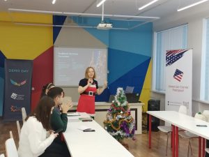 Координатор American Corner Petropavlovsk Вера Першина рассказала о том, как празднуется Рождество в Америке. Для студентов была проведена игра на английском языке, по завершении которой выигравшему достался новогодний приз.