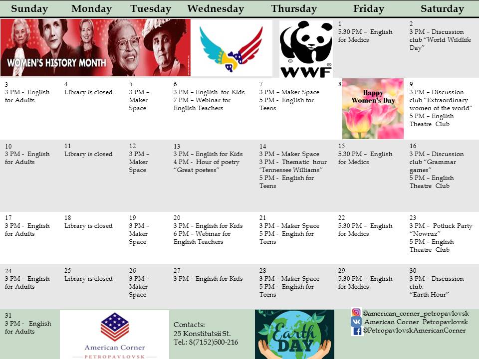 Календарь Американского уголка на март 2019
