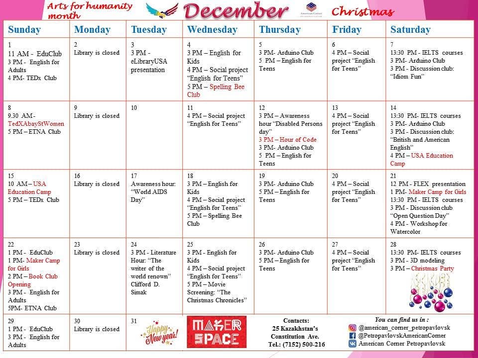Календарь мероприятий American Corner Petropavlovsk на декабрь