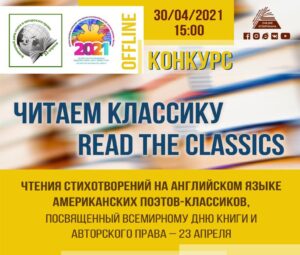 В зале мировой литературы областной библиотеки имени Сабита Муканова сегодня состоится конкурс «Читаем классику»= “Read the classics” чтения стихотворений на английском языке американских поэтов-классиков, посвященный Международному Дню книги - 23 апреля среди учащихся 8-10 классов.