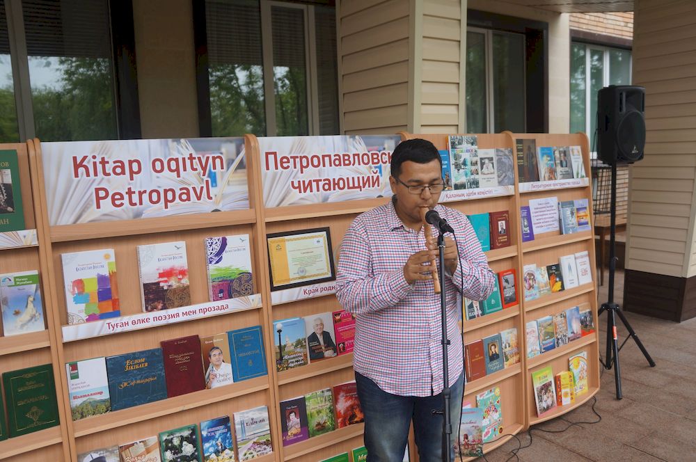 Праздничная программа была очень интересной и насыщенной. Виртуозную игру на домбре сменяли поздравления и пожелания в стихах и прозе от североказахстанских поэтов, писателей, актёров, а чарующие звуки флейты манили прохожих и зазывали на уютную площадку.