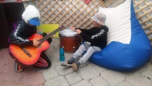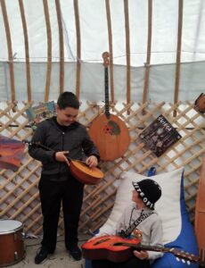 А в нашей юрте всё так же интересно и уютно, за счёт живых кресел, пуфиков, и музыки из проигрывателя, где ставили пластинки известных исполнителей. И, конечно, любителей пофотографироваться было хоть отбавляй. Иногда непогода загоняла спрятаться от моросящего дождя к нам, но чаще заходила креативная молодёжь и играла на инструментах, создавая уют в юрте для посетителей.