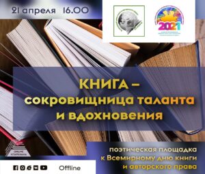 Ежегодно Всемирный день книги и авторского права отмечается 23 апреля. Впервые «Всемирный день книги и авторского права» был организован и отмечен 23 апреля 1996 года по резолюции Генеральной конференции ЮНЕСКО, с целью привлечь внимание к повышению авторитета писательской деятельности и созданию правовых норм для неукоснительного соблюдения в разных странах норм авторского права. Этот день можно назвать профессиональным событием не только для писателей и издателей, но и журналистов, редакторов, поэтов, публицистов и даже интернет-блоггеров. И в преддверии этого замечательного праздника мы проводим поэтическую площадку оffline «Книга – сокровищница таланта и вдохновения».