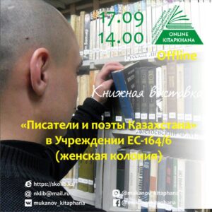 Сегодня сотрудниками библиотеки будет проведено выездное мероприятие оffline книжная выставка под названием «Писатели и поэты Казахстана» в специализированном Учреждении ЕС-164/6 (женская колония). Мы расскажем о писателях и поэтах нашей страны.