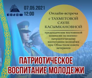 В преддверии майских праздников 7 мая и 9 мая о деятельности о работе по патриотическому воспитанию молодёжи рассказала Тахметова Сауле Касымкановна – председатель постоянной комиссии по военно-патриотическому воспитанию молодёжи при Областном совете ветеранов.