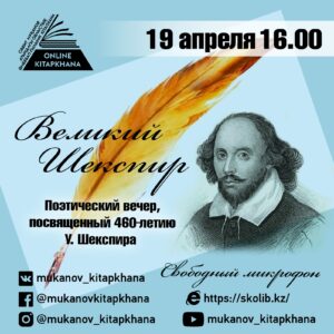 Поэтический вечер «Великий Шекспир», посвященный 460-летию Уильяма Шекспира. В формате свободного микрофона - выступить смогут все. Областная библиотека имени Сабита Муканова, Зал литературы по искусству (3-й этаж).