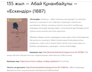 Каждое представленное произведение имеет собственную страницу с обложкой, подробной информацией и ссылками на популярные ресурсы, благодаря которым известные книжные памятники можно прочитать совершенно бесплатно. Среди таких порталов - Казахстанская национальная электронная библиотека (КазНЭБ), Электронная библиотека ОУНБ им. С.Муканова, библиотека электронных книг ЛитРес.