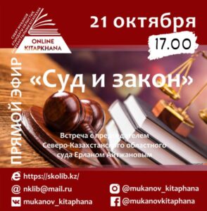 Приглашаем на наш новый онлайн-проект «Суд и закон» в прямом эфире. Сегодня состоится встреча с председателем Северо-Казахстанского областного суда Ерланом Жумахановичем Айтжановым. О работе областного суда, о взаимодействии с населением и об интересных делах, постараемся поговорить на нашей встрече в прямом эфире наших социальных сетей для зрителей, читателей, подписчиков областной библиотеки.