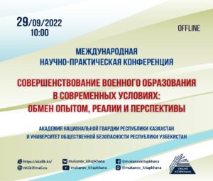 Приглашаем на оffline Международную научно-практическую конференцию «Совершенствование военного образования в современных условиях: обмен опытом, реалии и перспективы». Организаторами выступили Академия Национальной гвардии Республики Казахстан и университет общественной безопасности Республики Узбекистан совместно с нашей Областной библиотекой имени Сабита Муканова.