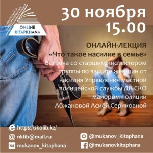 Приглашаем на онлайн-лекцию под названием «Что такое насилие в семье». Встреча со старшим инспектором группы по защите женщин от насилия Управления местной полицейской службы ДП СКО майором полиции Абжановой Асиёй Сериковной.