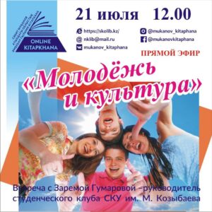 Приглашаем на прямой эфир «Молодёжь и культура» на онлайн встречу с Заремой Гумаровой –руководителем студенческого клуба Северо-Казахстанского университета имени М. Козыбаева.