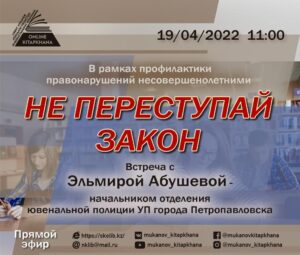 Приглашаем на прямой эфир в рамках профилактики правонарушений несовершенолетними «Не переступай закон». Встреча с Эльмирой Абушевой - начальником отделения ювенальной полиции УП города Петропавловска.