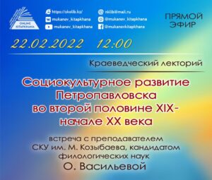 Приглашаем на прямой эфир краеведческого лектория на тему: «Социокультурное развитие Петропавловска во второй половине XIX – начале XX века» встреча с преподавателем СКУ им. М. Козыбаева, кандидатом филологических наук Ольгой Васильевой.