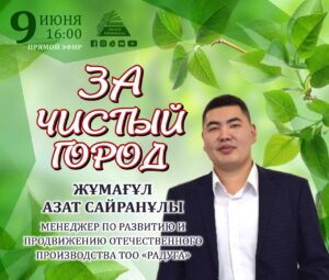 Приглашаем на прямой эфир «За чистый город». У нас в гостях Жұмағұл Азат Сайранұлы менеджер по развитию и продвижению отечественного производства ТОО «Радуга». Как выйти в лидеры и завоевать клиентов? Чем отечественное производство лучше? Что и как правильно можно предложить покупателям? Об этом и о многом другом поговорим сегодня в прямом эфире с нашим специальным гостем.