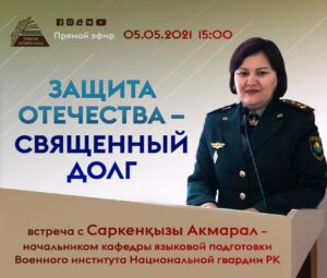 Приглашаем на прямой эфир «Защита Отечества – священный долг» онлайн-встречу с Саркенқызы Акмарал –начальником кафедры языковой подготовки Военного института Национальной гвардии РК.
