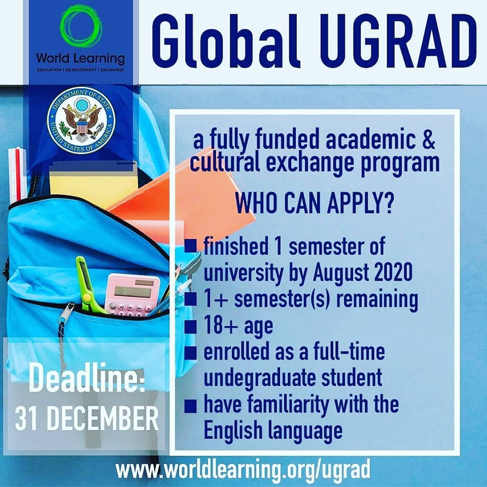 Global #UGRAD 2020-2021 бағдарламасына өтінімдер қабылдауды ашық деп жариялаймыз! Құжаттарды қабылдаудың соңғы күні – 2019 жылдың 31-ші желтоқсанына дейін.