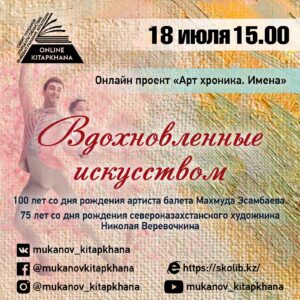 Прямой эфир «Вдохновленные искусством». Онлайн-проект «Арт хроника. Имена». 100 лет со дня рождения артиста балета Махмуда Эсамбаева; 75 лет со дня рождения североказахстанского художника Николая Веревочкина.