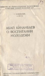 1954 жылы Алматы қ. Казгосиздат баспасынан шыққан. Орыс тілінде шыққан бұл кітапта автор Абайдың шығармаларының жастарды тәрбиелеудегі маңыздылығына ақынның өлеңдерін жан-жақты талқылау арқасында назар аударады.