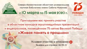 УВАЖАЕМЫЕ ПОЛЬЗОВАТЕЛИ И ПОДПИСЧИКИ Областной универсальной научной библиотеки им. С. Муканова! ПРИГЛАШАЕМ ВАС принять участие в областном конкурсе мультимедийных презентаций и видеороликов, посвящённом 75-летию Великой Победы «Живая память о прошлом»