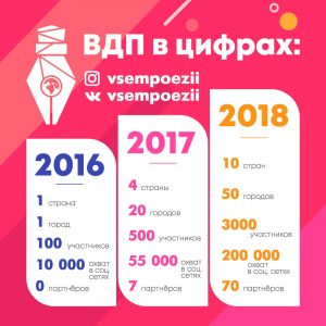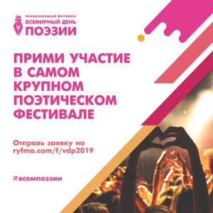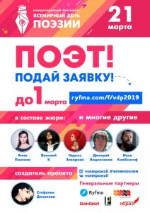 21 января стартовал прием заявок на IV Международный фестиваль «Всемирный День Поэзии» - «ВДП 2019». Создатель ВДП – Стефания Данилова, санкт-петербургская поэтесса. География – 10 стран и 56 городов.