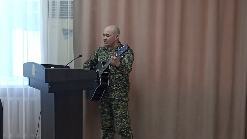 Украсили встречу музыкальные номера: заместитель командира 2 учебного батальона по Воспитательной и Социально-правовой работе, подполковник Алимжан Алибаевич Тасмагамбетов исполнил несколько тематических песен, трогающих душу, и курсант Академии НГ РК Аслан Ғаниұлы исполнил на домбре национальную мелодию.