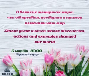 «About great women whose discoveries, actions and examples changed our world». В мире за всю историю человечества очень много женщин, которые оставили значимый след после себя. Об этом и о многом другом сегодня поговорим в прямом эфире.